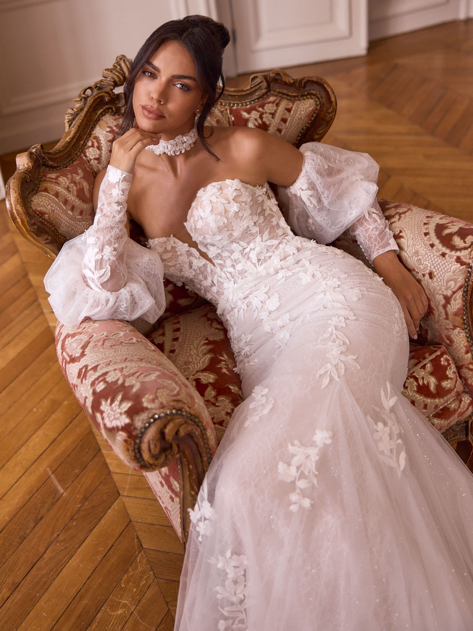 Dieses verführerische, figurbetonte Meerjungfrauen-Brautkleid ist aus hochwertiger Spitze und glitzerndem Tüll gefertigt. Die Verarbeitung von floraler Baumwollspitze verleiht dem Kleid eine besonders edle Note. Es verfügt über lange, voluminöse Puffärmel und eine beeindruckende, lange Schleppe für einen royalen Auftritt. Das Design besticht durch einen transparenten geraden Rücken mit Illusion-Effekt und ein romantisches Herz-Ausschnitt-Dekolleté. Für zusätzlichen Komfort wurde ein herausnehmbares Futter integriert. Die natürliche Taillenlinie betont die Silhouette perfekt. Allegra wird am Rücken mit einem Reißverschluss und Knöpfen geschlossen. Alle LIMITED-Kleider von Bianco Evento werden sorgfältig in der EU entworfen und in einem unserer hauseigenen Produktionen hergestellt.