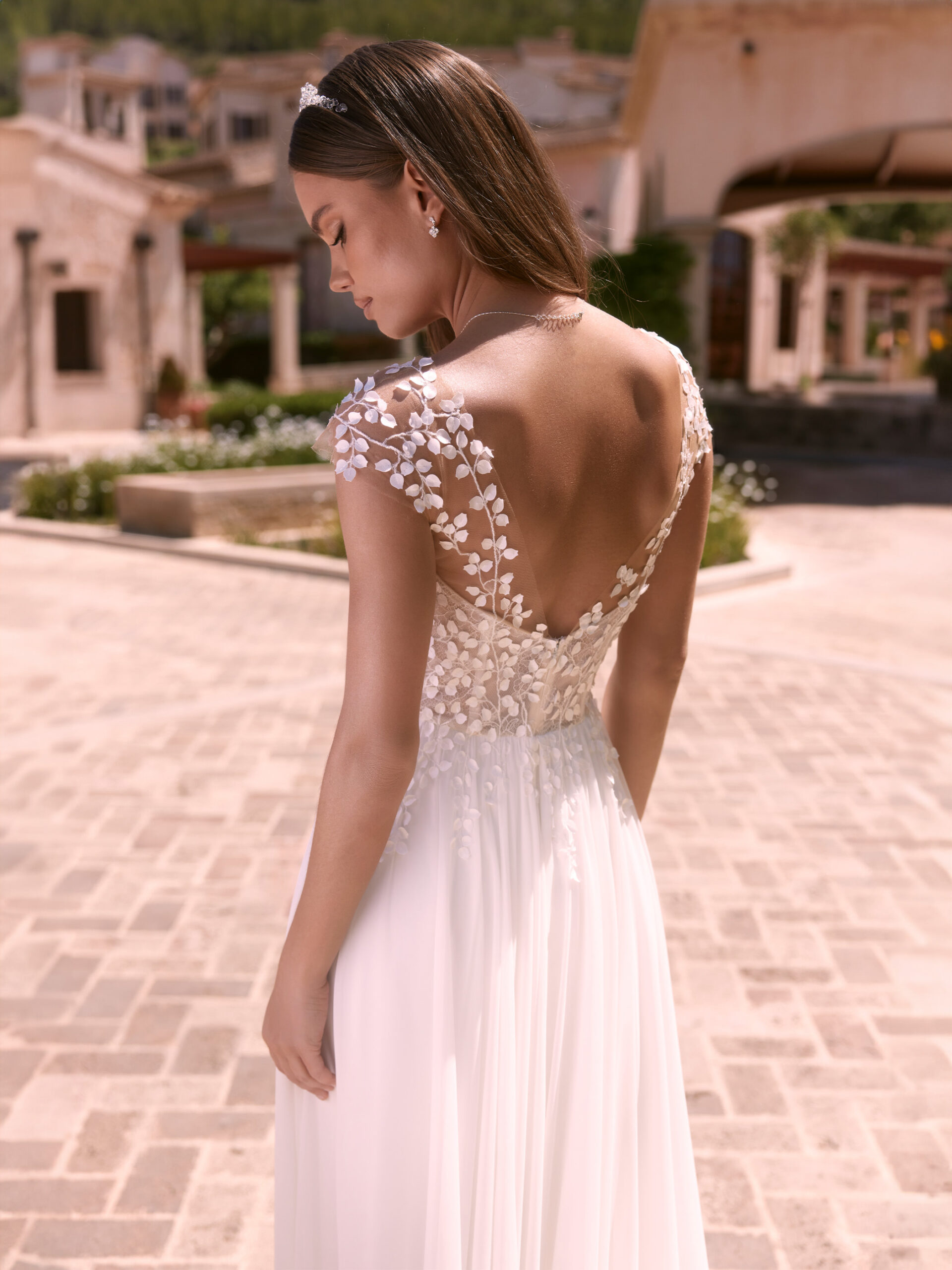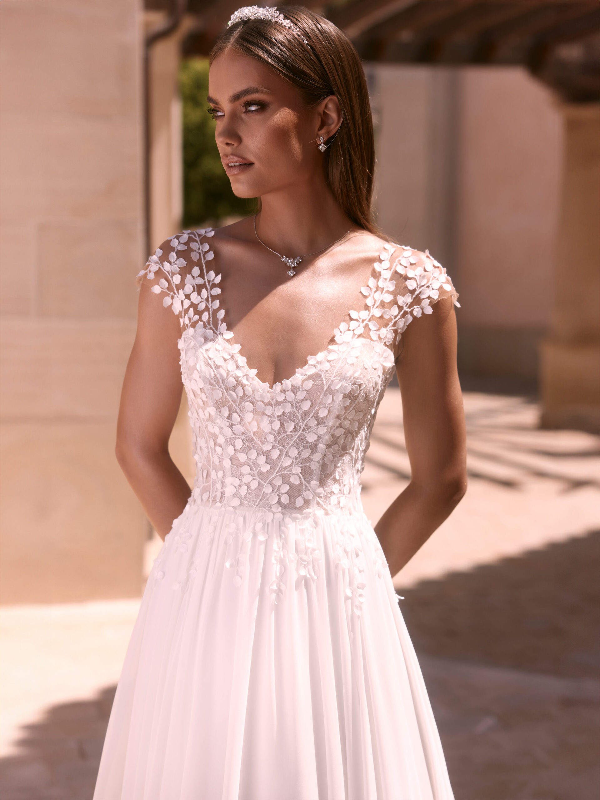 DORIDIS ist unser romantisches A-Linie Brautkleid, gefertigt aus hochwertigem Chiffon und Spitze. Dieses wunderschöne Kleid verfügt über eine lange Schleppe, einen Herzausschnitt und einen V-Rücken. Es betont eine natürliche Taille und schmeichelt die Silhouette. Verziert mit moderner Blätter-Spitze und kurzen Kappärmeln, strahlt dieses Kleid Eleganz aus. Alle Bianco Evento Brautkleider werden sorgfältig in der EU entworfen und in einem unserer eigenen Produktionsstandorte hergestellt.