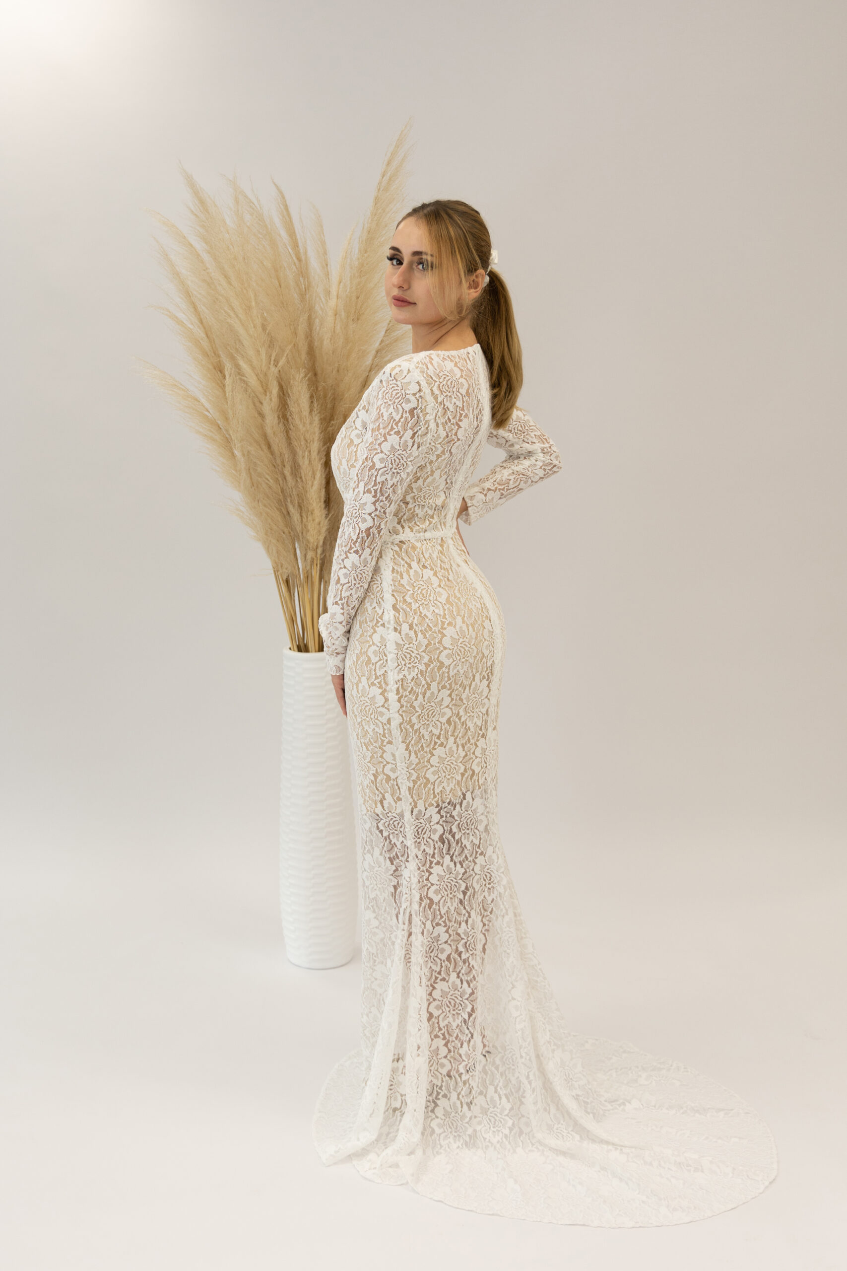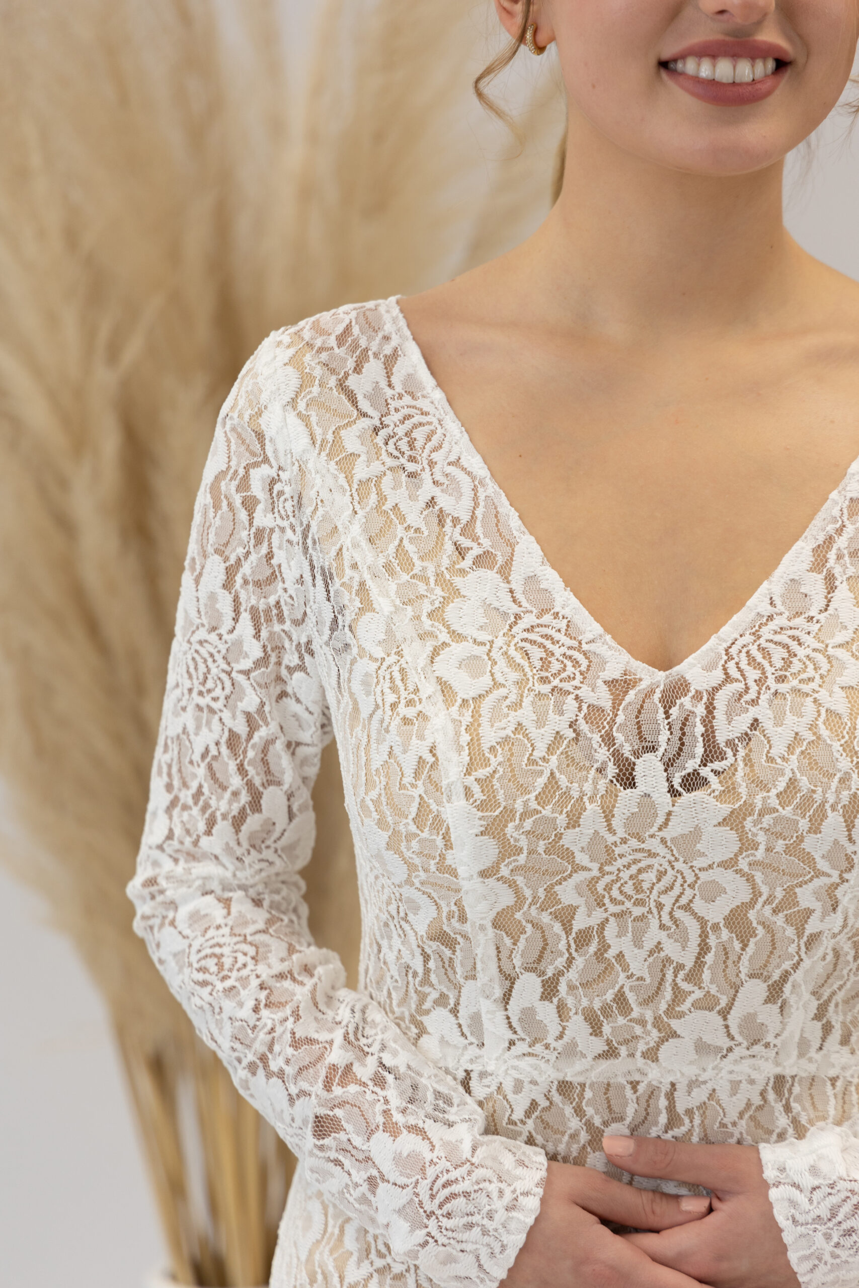 Dieses Brautkleid aus elastischer Blütenspitze besticht durch seine zarte Transparenz und feminine Eleganz. Die soften Spitzenstoffe schmiegen sich sanft an den Körper an und sorgen für ein angenehm leichtes Tragegefühl – ideal für Bräute, die sich an ihrem großen Tag frei und natürlich bewegen möchten. Mit seinem langen, figurbetonten Schnitt und den langen Ärmeln verleiht das Kleid eine elegante, aber zugleich moderne Silhouette. Die feine Spitze mit floralen Motiven wirkt edel und romantisch zugleich. Ein besonderes Highlight: Das Kleid kann mit verschiedenen Unterkleidern kombiniert werden – wahlweise in zarten Nude-, Champagner- oder Ivory-Tönen, um den Look individuell zu gestalten.