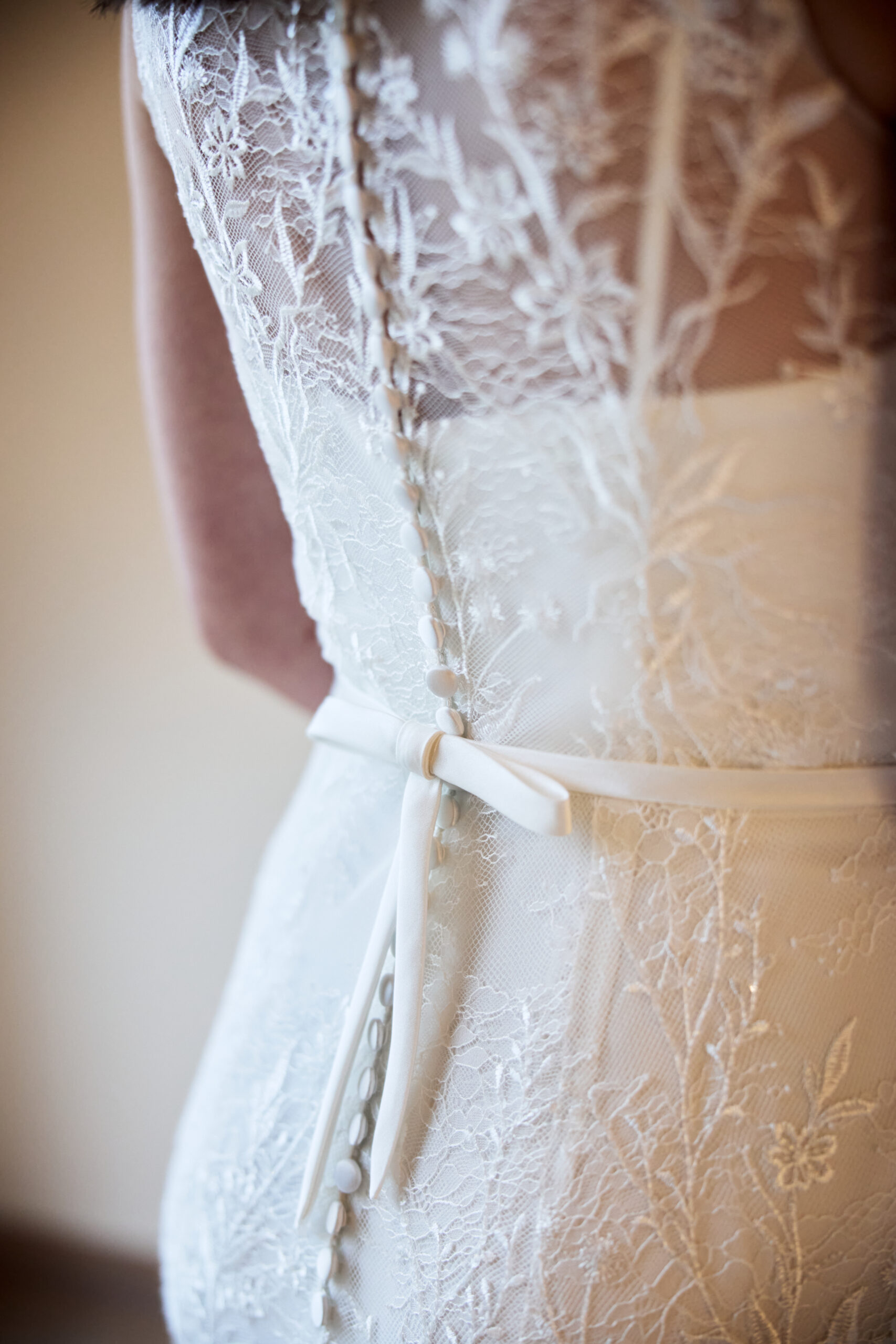 • Der First Look: Während der Trauung strahlt Rina pure aristokratische Eleganz aus. Ein exquisites Spitzenoberkleid mit hochgeschlossenem Ausschnitt und einer prachtvollen, detailreichen Schleppe hüllt die Braut in zeitlose Romantik. Die filigrane Knopfleiste am Rücken und das dezente Schleifenband an der Taille betonen dabei eine wunderschön feminine Silhouette.