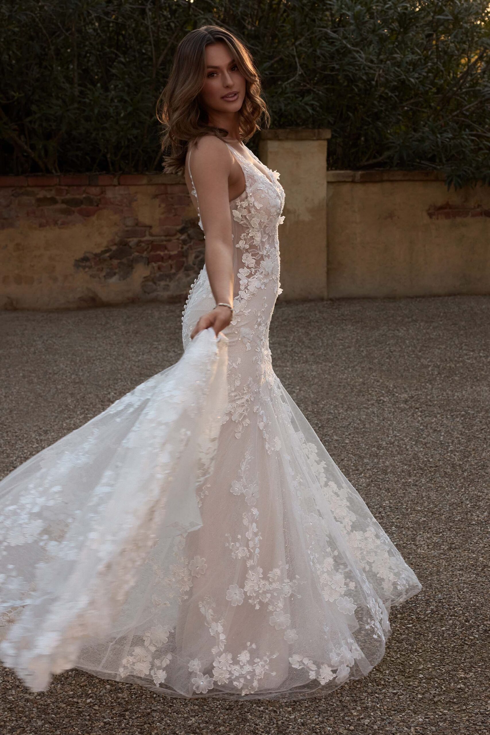 Sevilla ist die ultimative Schönheit aus allen Blickwinkeln und wird garantiert alle Blicke auf sich ziehen. Dieses Kleid aus luxuriösen Materialien wie Glitzertüll, nebligem Tüll und Stretch -Jersey wurde entworfen, um sicherzustellen, dass die moderne Braut sowohl stilvoll als auch bequem ist. Mit einem sexy tiefen V-Ausschnitt mit floralen Spitzenapplikationen lenkt Sevilla den Blick auf die natürliche Taille. Die Träger führen zum romantischen Illusionsrücken mit floral inspirierten Spitzendetails und stoffbezogenen Knöpfen, die Sevilla zu einem eleganten und dennoch sexy Kleid machen! Dieses Kleid wird noch eindrucksvoller: 3D-Applikationen aus floraler Spitze rieseln vom Oberteil über den Rock bis hin zur atemberaubenden blütenblattförmigen Schleppe.