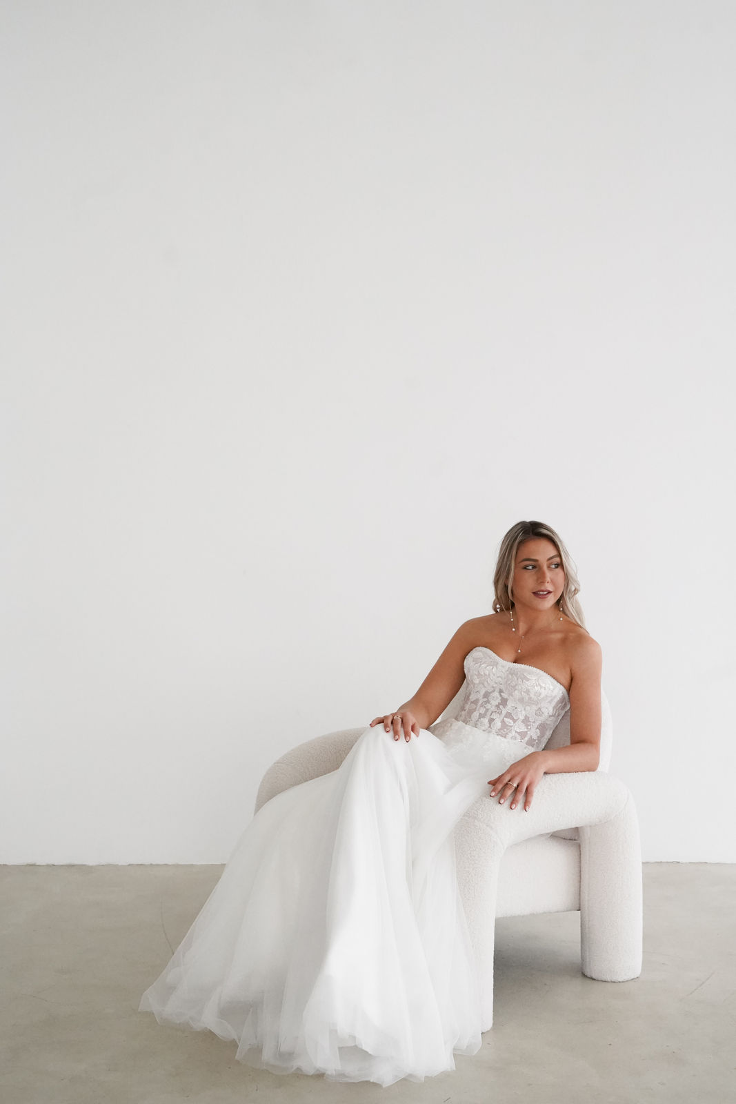 Sihana strahlt verspielte Romantik und moderne Leichtigkeit aus. Das trägerlose Bustier ist mit aufwendiger, floraler Spitze und dezenten Pailletten verziert, die sanft in den luftigen Rock übergehen.