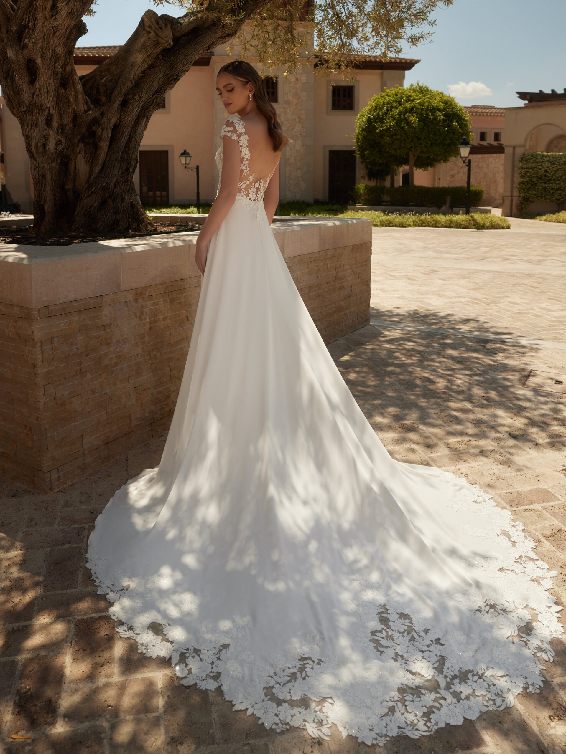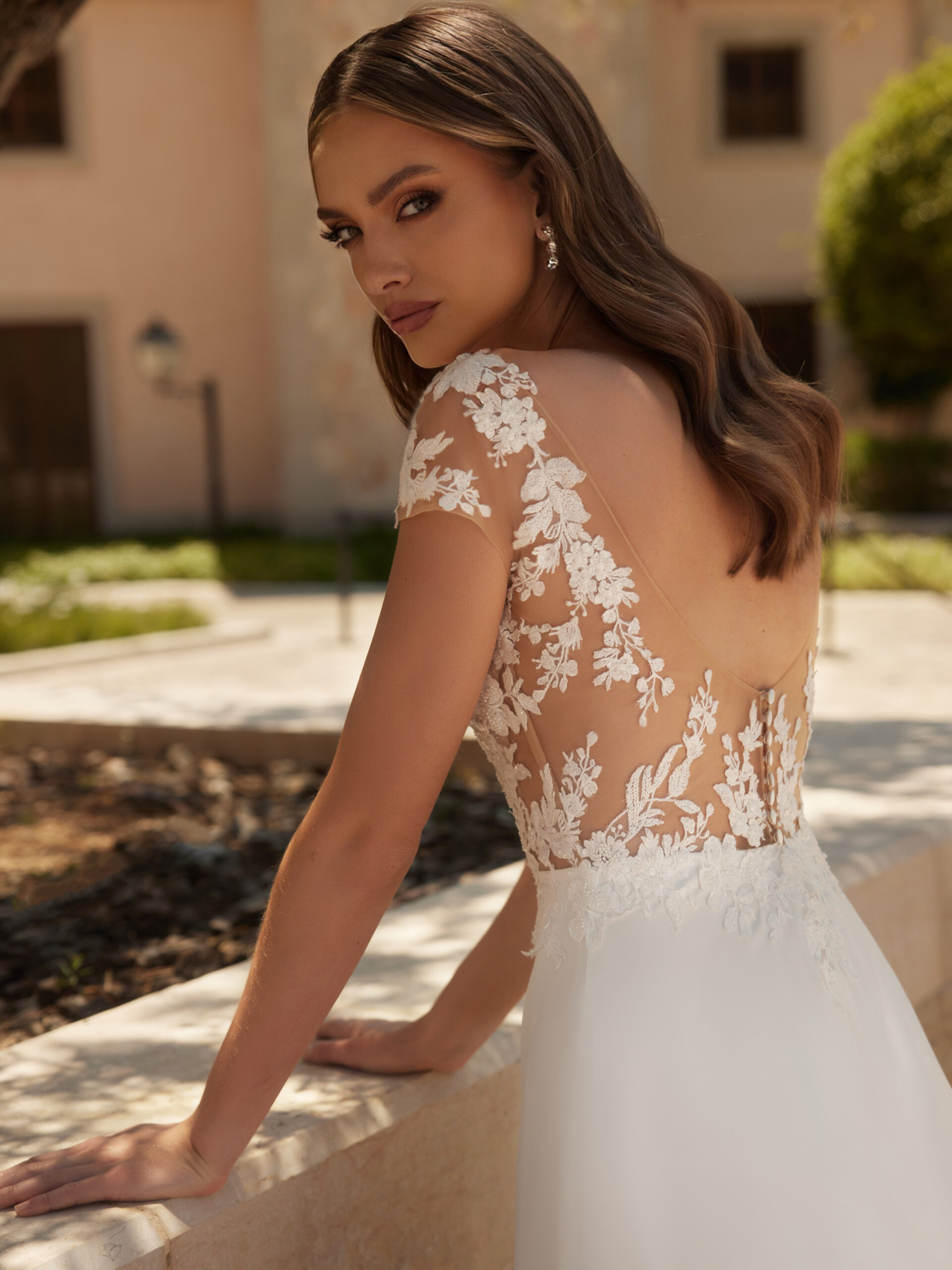TURQUOISE ist ein A-Linien-Brautkleid aus leichtem Georgette und kristallbestetzte Spitze. Das moderne Brautkleid hat Kappa-Ärmel, einen V-Ausschnitt vorne und einen abgerundeter Rücken. Alle Bianco Evento Brautröcke werden sorgfältig in der EU entworfen und in einem unserer eigenen Produktionsstandorte hergestellt.